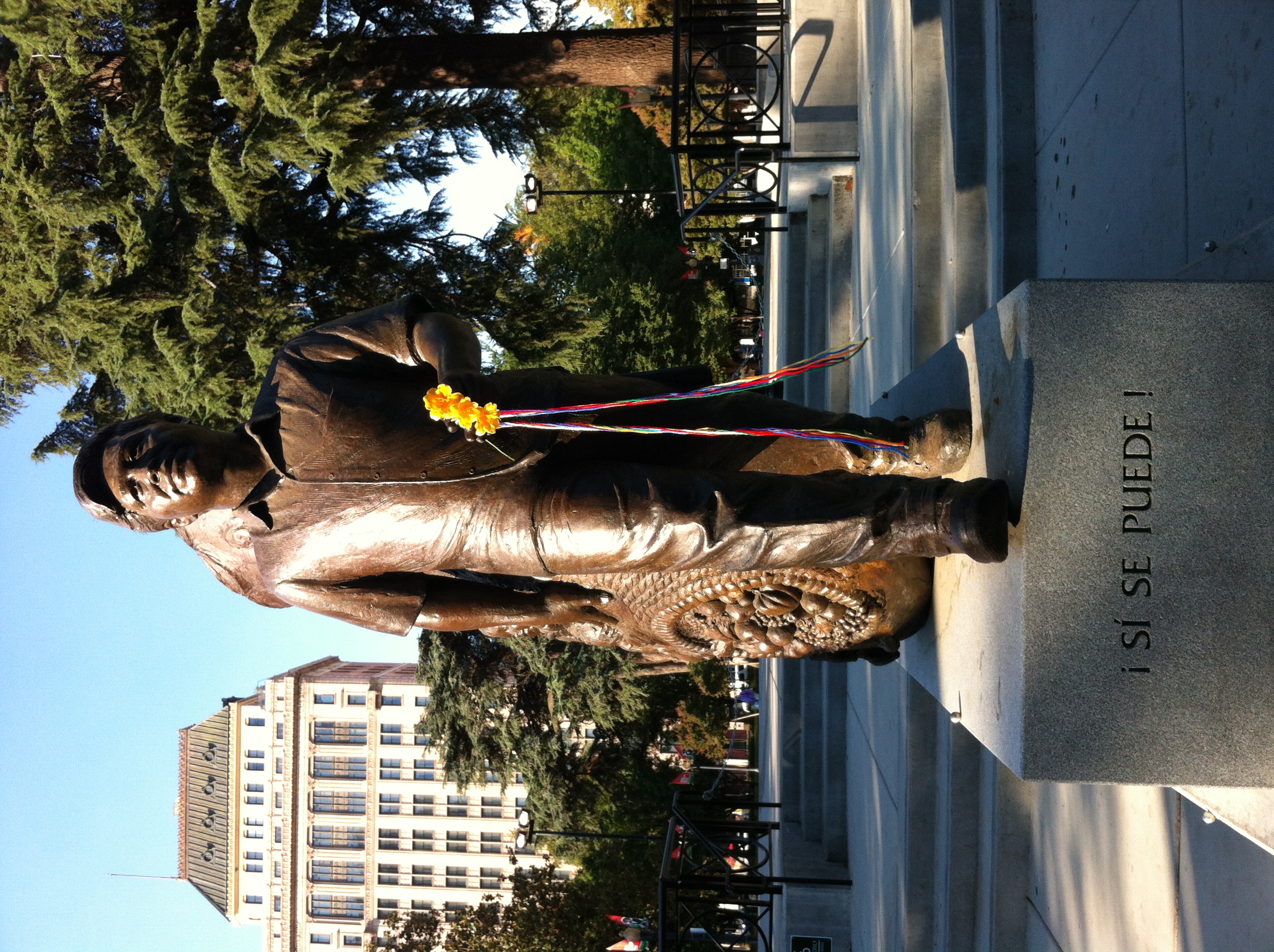 July 31, 2014, Drumming and Chanting the Na-Mu-Myo-Ho-Ren-Ge-Kyo at Cesar Chavez Plaza in Sacramento 7:30-8am at Memorial Statue holding the first Rainbow Uprising of Consciousness Peace Pole, offered on Sunday July 27th by email and formally on July 30th in hand written invitation to California Governor Jerry Brown to conduct Peace Pole Ceremony on the Capitol lawn at Noon July 31st. Cesars statue is holding the peace pole and a yarn set for a Rainbow Peace Braid.
