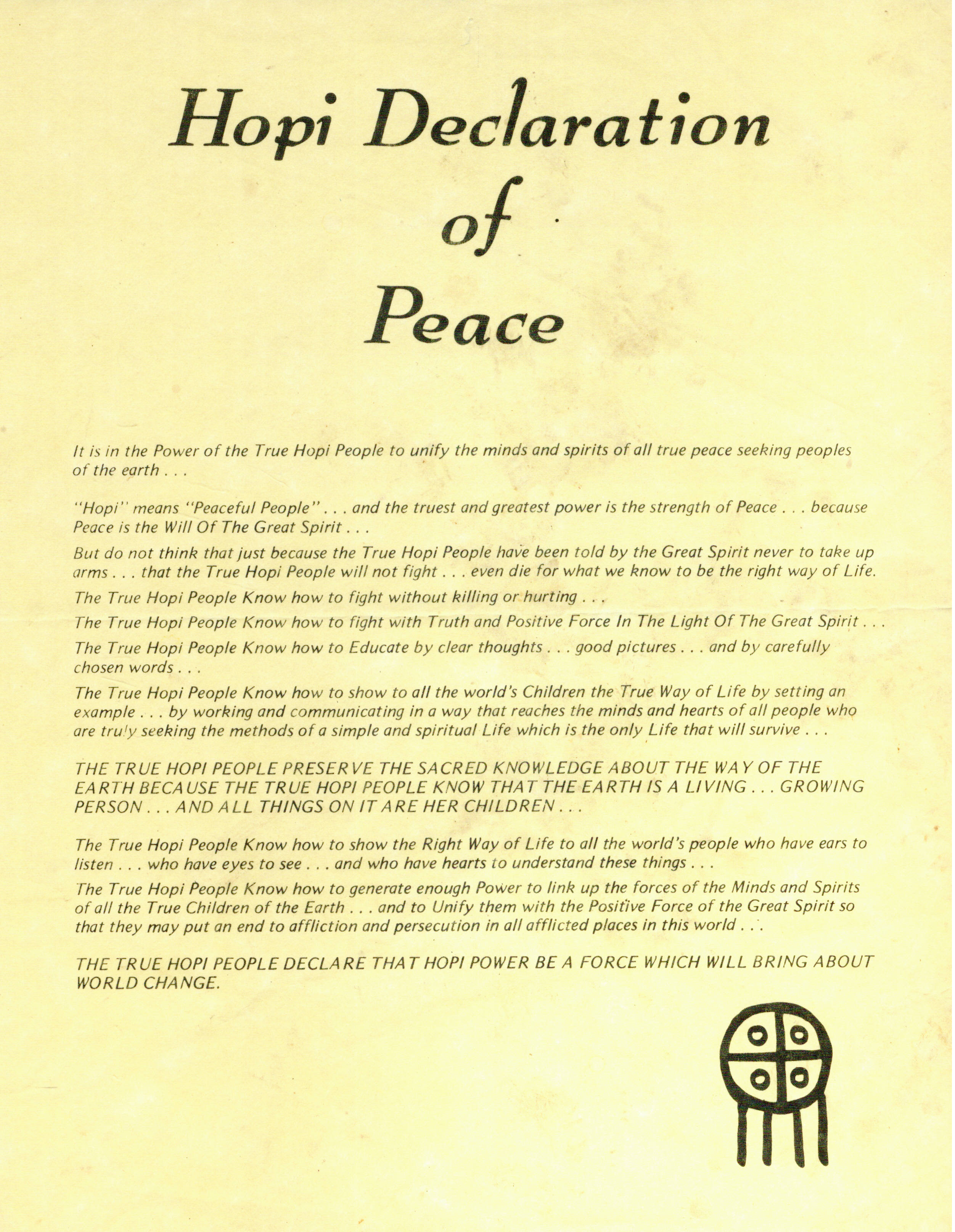 Hopi Declaration of Peace -- Hopi Invitation to the World's Spiritual Leaders to Meet -- "Official" Hopi Prophecy
