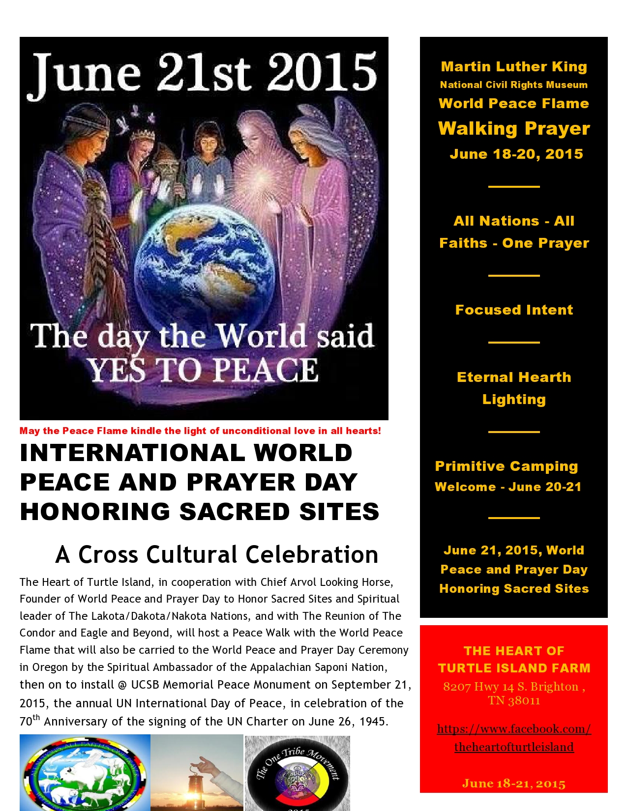 This 2015 Summer of Unconditional Love Tour will begin on the Summer Solstice, June 21, 2015, at the Ashland Oregon 20th Annual World Peace and Prayer Day Honoring Sacred Sites Ceremony gathering (June18-21) conducted by the 19th generation Keeper of the White Buffalo Calf Pipe, Lakota-Dakota-Nakota Chief Arvol Looking Horse, where the World Peace Flame will be carried by courier via a rigorous cross country drive from Memphis starting 18June. http://worldpeaceandprayerday.com