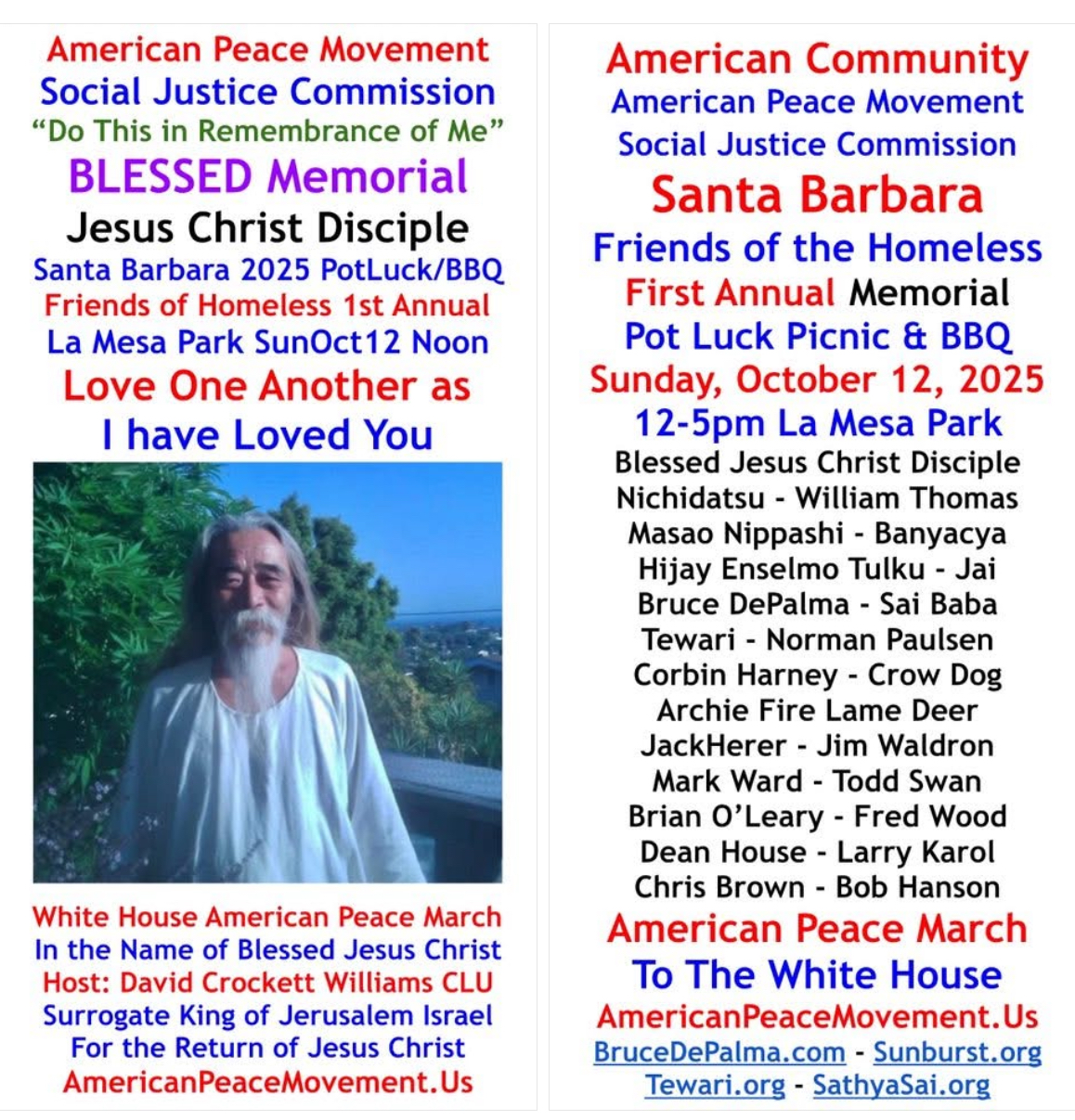 Especially Honoring my late friend Blessed (aka Ikuma Ohtsu), a fellow Jesus Christ Disciple, whom I met in 1979 in Isla Vista as a Japanese hippie artist. I arranged for him to visit the Chumash Spiritual Camp at Point Concepcion. Whereafter, he became “Blessed,” walking barefoot wearing white robes, preaching with his ever-present Bible, and giving out money and pot to the homeless, aka “Weed Jesus.” **