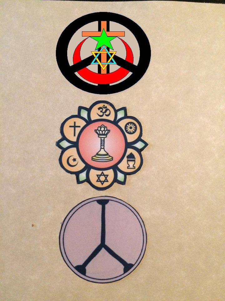 This graphic contains three symbols of The Message of Peace. The first is the "Three Faiths United in Peace" symbol created by Sherwood Acuna for the Christmas 2005 Bethlehem to Jerusalem Peace Walk conducted by members of the Jerusalem Peacemakers organization including Haj Ibrahim Abu Al Hawa who is awaiting completion of the this style peace pole for installation at his East Jerusalem Peace House as the Santa Barbara Peace Pole for Jerusalem.